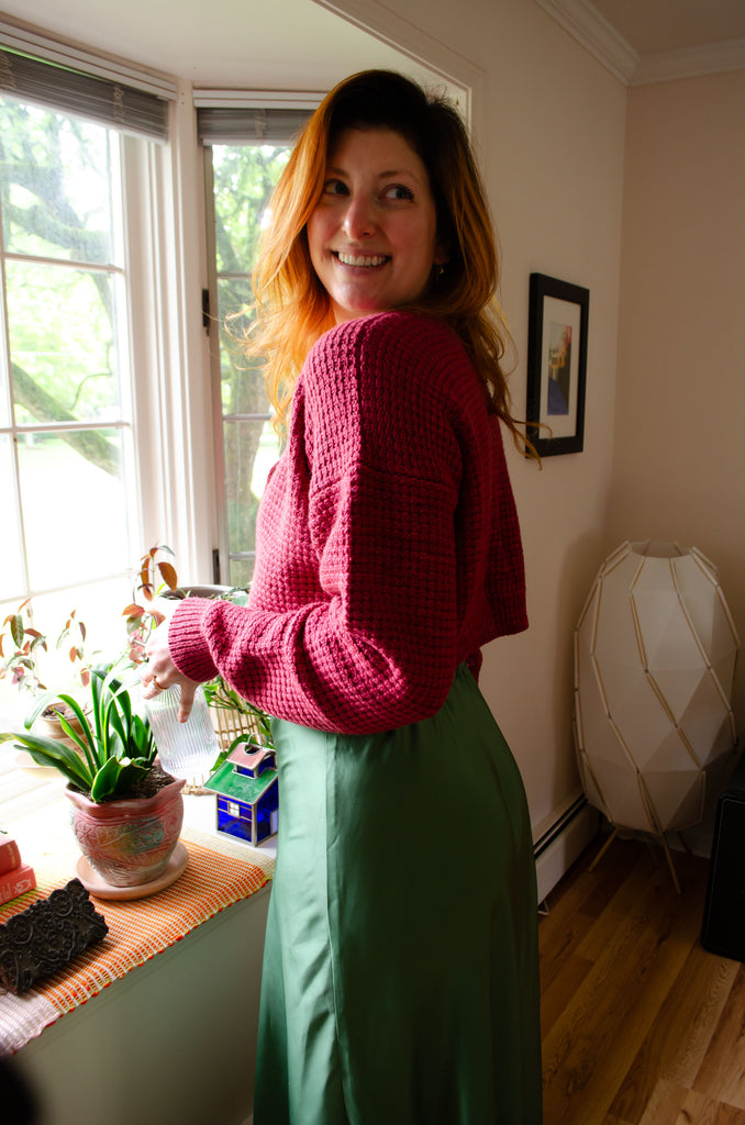 Interthreading Pullover: "Eggshell" (MC) Classic DK + "Seal", "Palmetto", and "Cardinal" (CCs) Classic DK