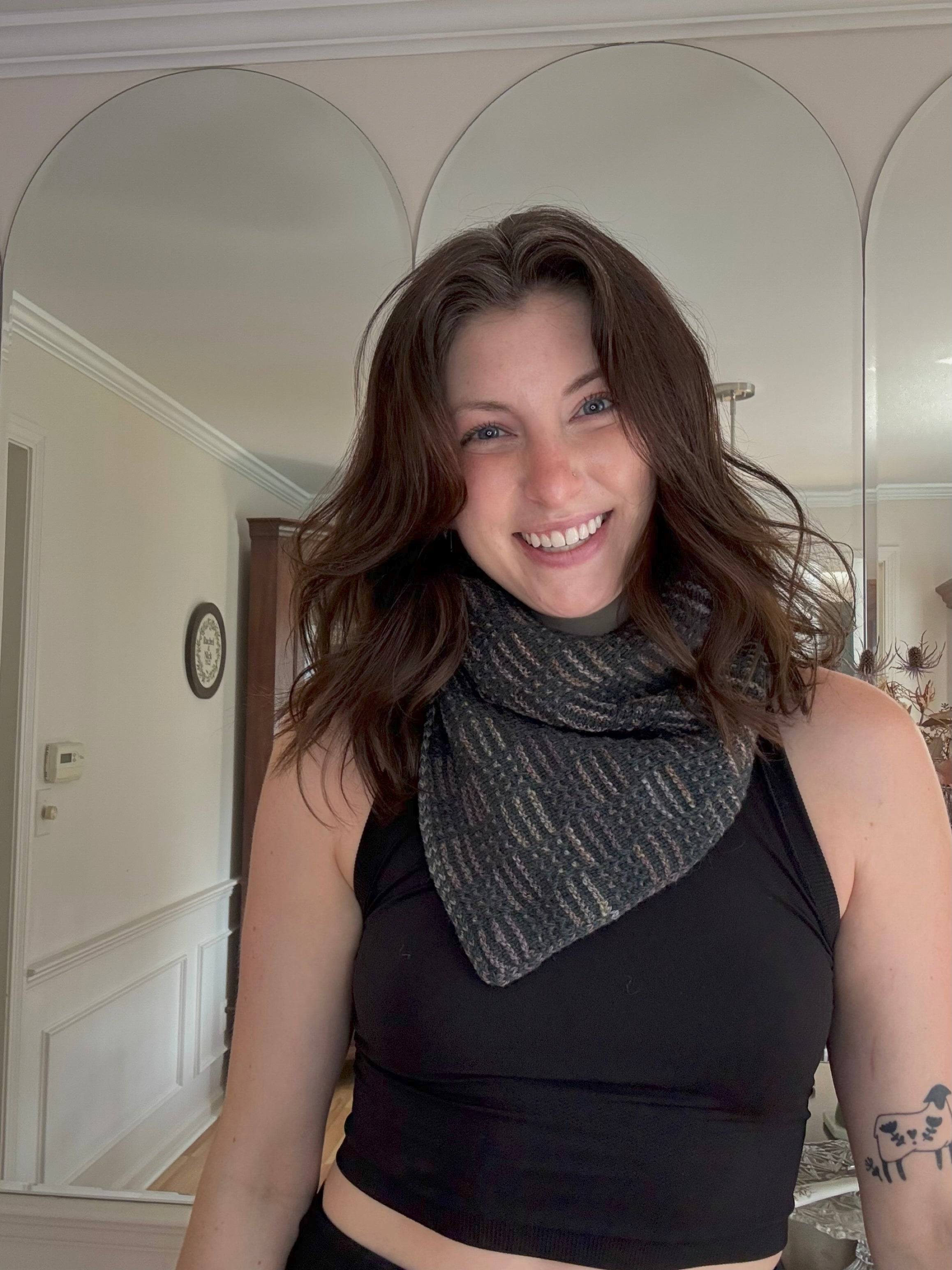 Grid Gambit Cowl: "Petrichor" Woolen Fingering + handspun "Elberdritchel" American Rambouillet fiber