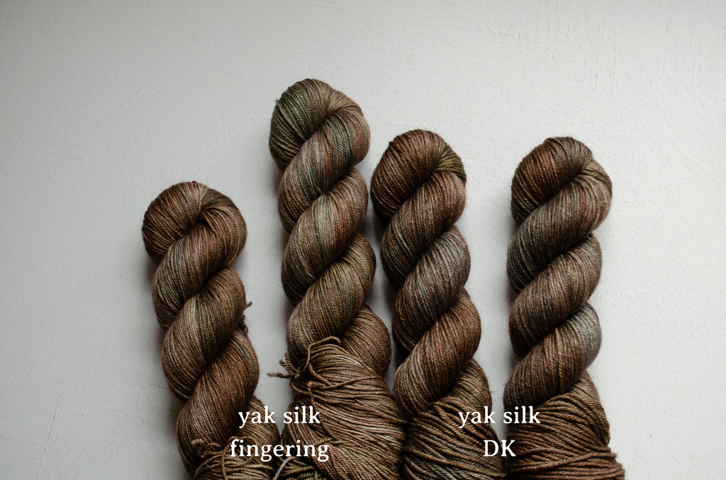 60% superwash merino, 20% silk, 25% yak43 ply, 231 yards per 100g skein