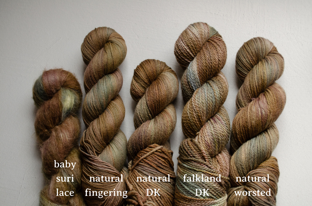 70% falkland wool, 15% baby alpaca, 15% silk 2 ply, 268 yards per 100g skein