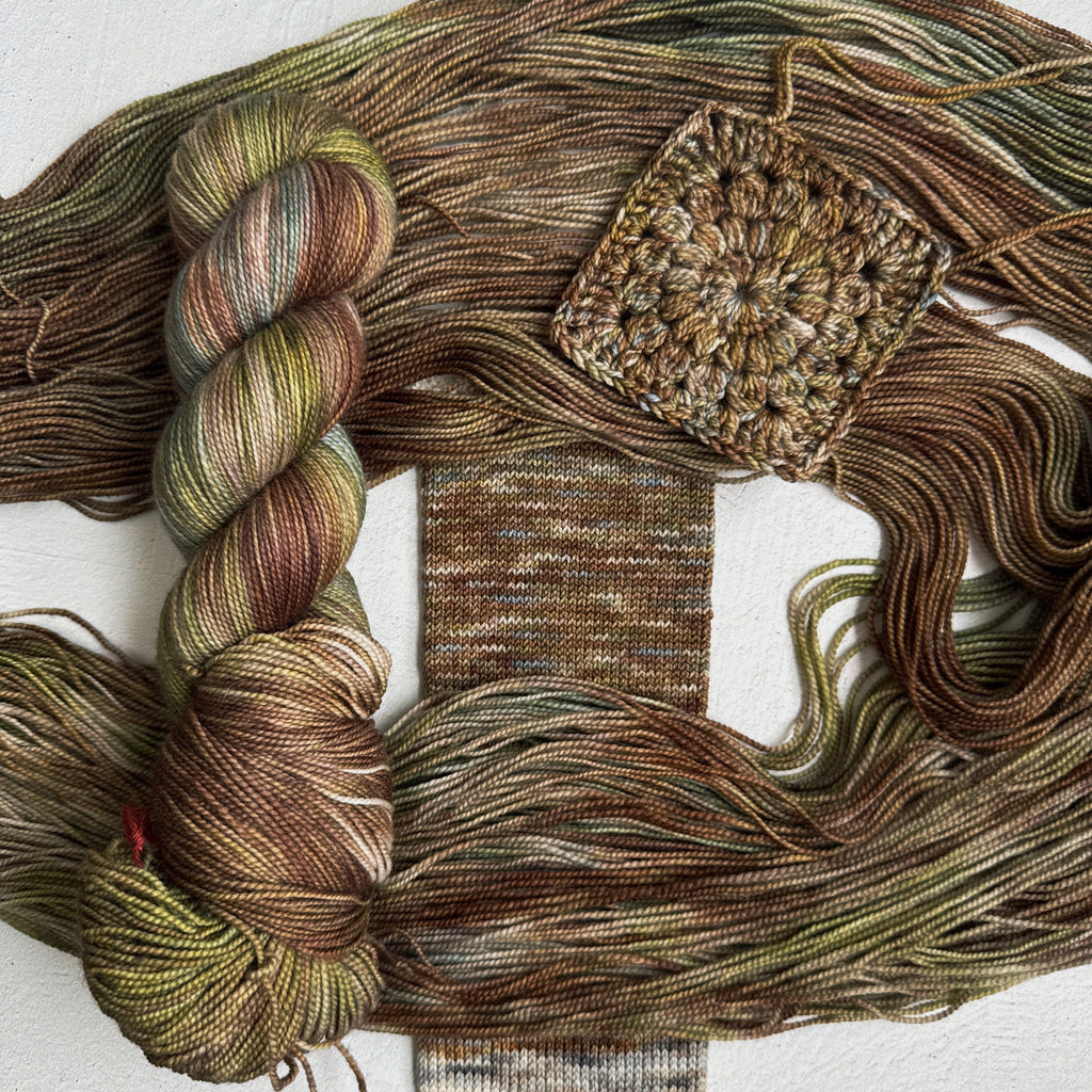 85% superwash merino, 15% donegal nep 4 ply, 231 yards per 100g skein
