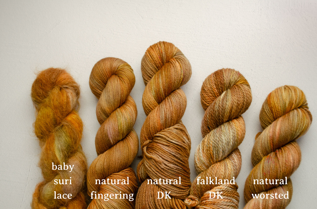 70% falkland wool, 15% baby alpaca, 15% silk 2 ply, 268 yards per 100g skein