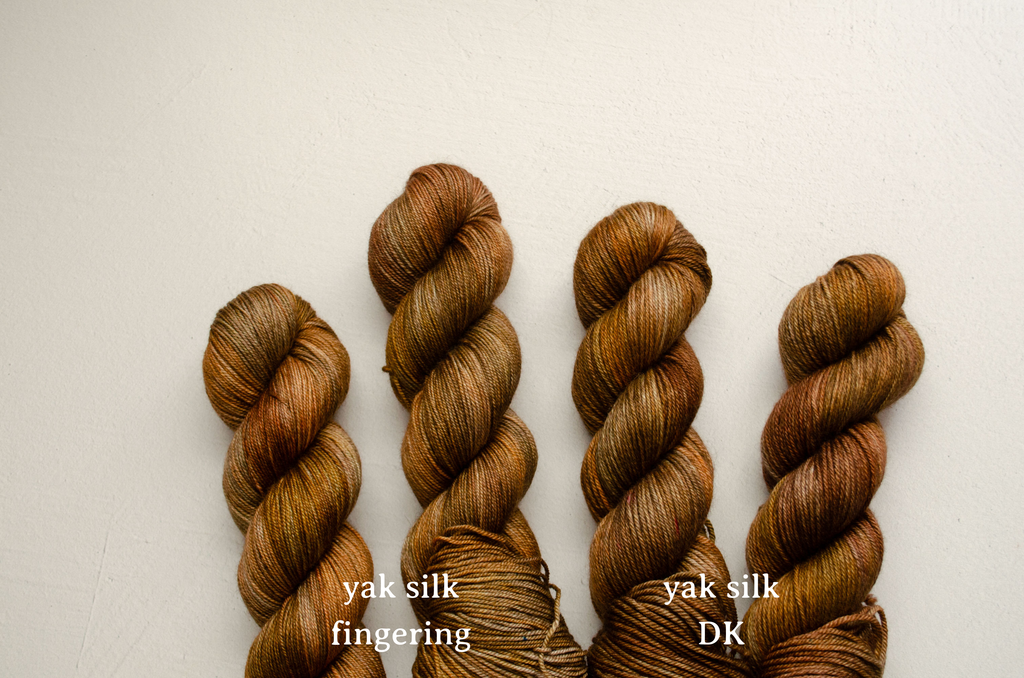 60% superwash merino, 20% silk, 25% yak43 ply, 231 yards per 100g skein