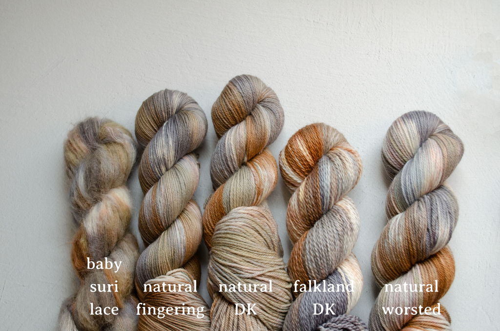 70% falkland wool, 15% baby alpaca, 15% silk 2 ply, 268 yards per 100g skein