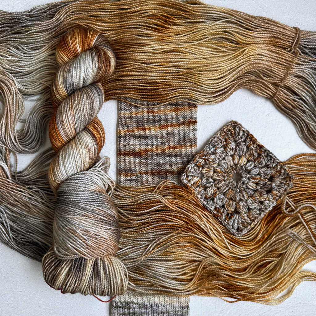 85% superwash merino, 15% donegal nep 4 ply, 231 yards per 100g skein