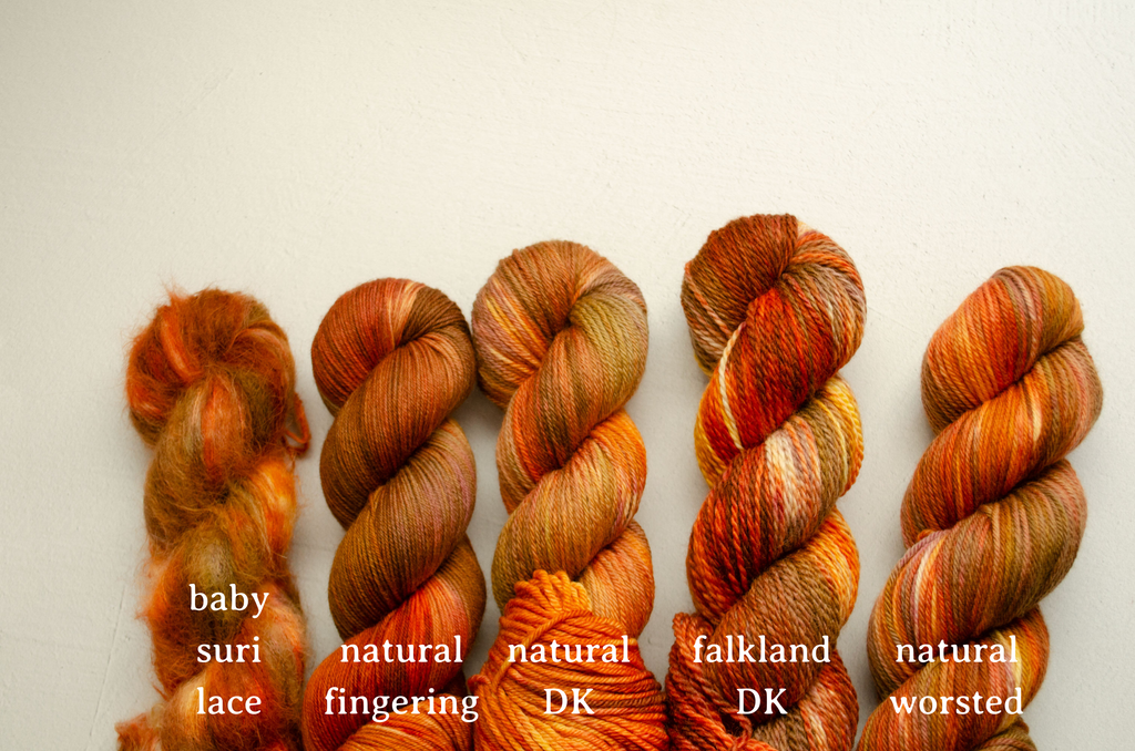 70% falkland wool, 15% baby alpaca, 15% silk 2 ply, 268 yards per 100g skein